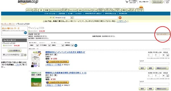 で、問題なのはこのほしい物リストなんですが、デフォルト(標準)ではほしい物リストの中身を公開する設定になっています。他のユーザがあなたの名前やメールアドレスから、あなたがほしい物リストに登録している内容を見ることができるようになっています。試しに自分のでもやってみたんですけど本当に全部見えてしまいました。