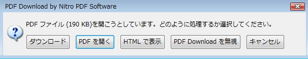 結論から言うと、ブラウザFirefoxにアドオン(拡張機能)で「PDF Download」というものがありますので、これをインストールすれば解決します。PDFファイルをクリックした時に自動で以下のような「ダウンロード」「PDFで開く」「HTMLで表示」などを選択できるウインドウが出てきます。